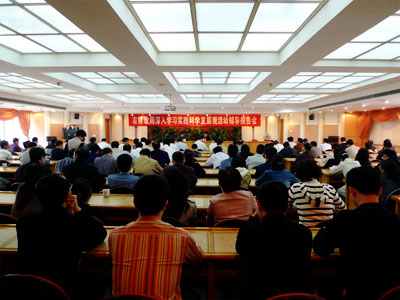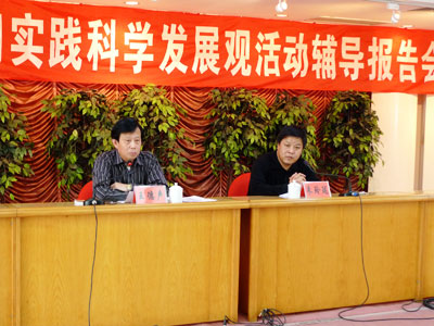 朱玲珑副校长主要从三个方面对深入学习实践科学发展观进行了辅导。一是正确认识科学发展观的形成历程;二是准确把握科学发展的深刻内涵;三是如何深入实践科学发展观。