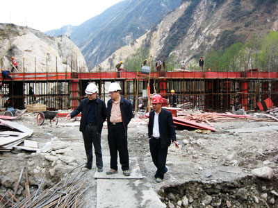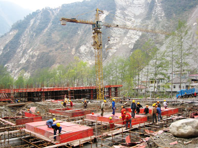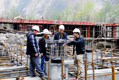 在市援建工作组的正确领导下,专责小组同志带着对灾区人民的特殊感情,带着帮助灾区重建家园的理想激情,围绕今年 5 月 12 日中心小学主体封顶和 8 月 20 日全面竣工这一目标,以科学理性和务实严谨的态度,带领我市援建施工企业 170 多名员工日夜奋战,努力克服雨雪霜冻和山体塌方、滚石等恶劣环境条件所带来的困难,科学严谨制订施工组织计划,千方百计确保建筑材料供应的有效保障,有力有效有序地推进公共服务设施项目的援建步伐。目前,公共服务设施项目施工进度正按计划推进。截止 3 月底,乡中心小学教学楼已完成二层板砼施工,正在进入三层柱的模板安装;学生宿舍楼已完成基础工程施工及橡胶隔震垫的安装,正在安装首层模板;教工宿舍楼已完成基础工程;卫生院及综合文化楼的基础工程正在抓紧施工。整个施工工地呈现一片热火朝天的景象。