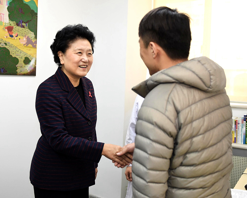 12月1日,在第29个世界艾滋病日之际,中共中央政治局委员、国务院副总理、国务院防治艾滋病工作委员会主任刘延东深入基层考察艾滋病防治工作并召开座谈会。这是刘延东在北京市朝阳区疾病预防控制中心自愿咨询检测室看望前来咨询的人员。新华社记者 李涛 摄