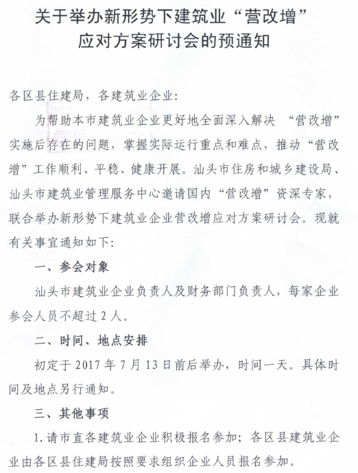 关于举办新形势下建筑业“营改增”应对方案研讨会的预通知